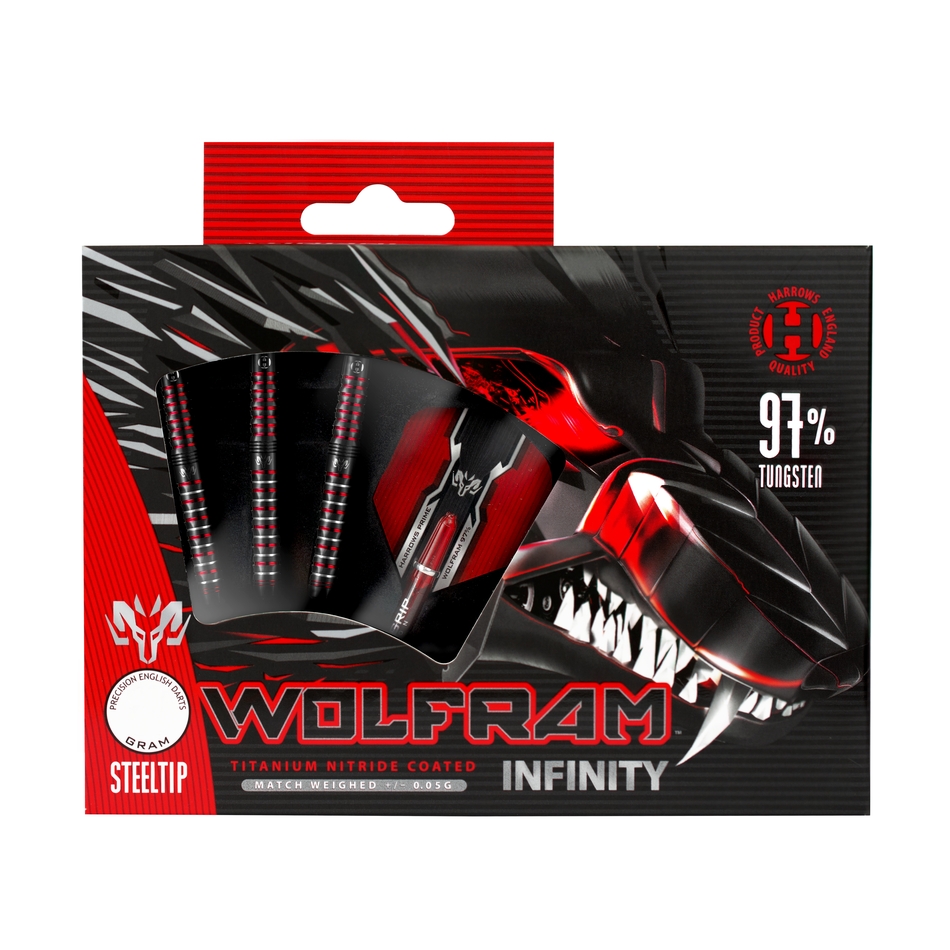 Since the introduction of our original Wolfram 97% tungsten darts 6 years ago, it has been one of the most popular darts on the market. Now it is time to welcome the second generation – Wolfram Infinity. Created using the finest injection moulded tungsten to maintain the iconic and much loved slim barrel, Wolfram Infinity has improved on the look, feel and performance of its predecessor. These darts are delicately turned on our Japanese CNC machines to create an intense, all over grip, ensuring a precise and consistent release. A striking combination of black titanium nitride and a vivid, red metallic coating, complete this stunning addition to the Wolfram family. The Wolfram Infinity darts are available in 6 different weights.