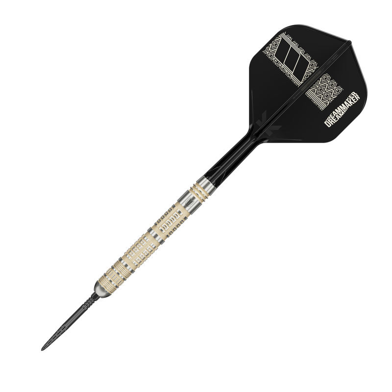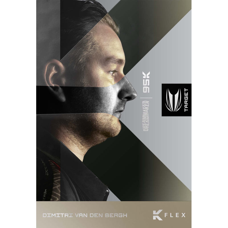 Paired with exclusive K-Flex integrated flight and shaft systems, the 95K darts offer unmatched durability and stability in-flight. The K-Flex system is moulded from a single piece, eliminating flight separation, and improving aerodynamics. The black flights are printed with Dimitri’s signature “DreamMaker” logo, adding a sleek, personal touch.