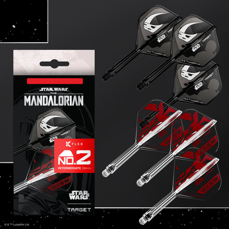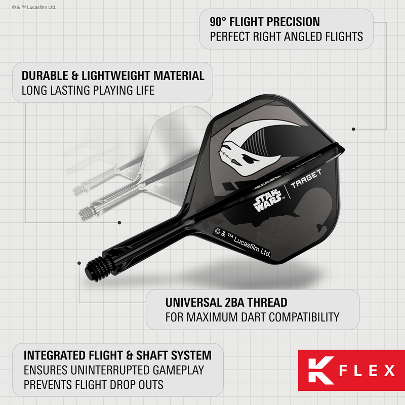 Upgrade your setup with the STAR WARS™ | TARGET Mandalorian K-Flex Integrated Flights and Shafts Multipack, created as an official collaboration with the Walt Disney Company.