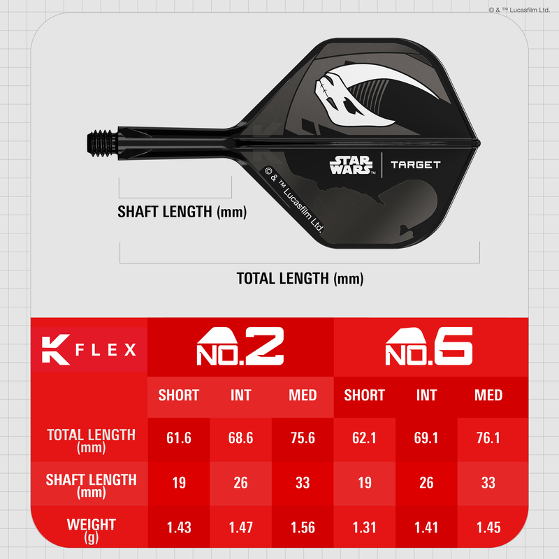 This set includes 6 K-Flex integrated flight and shaft systems, with 3 of each Mandalorian-inspired design. One design features a sleek black base with helmet graphics, while the other showcases a clear base with striking red Mandalorian-inspired graphics, creating a bold contrast and allowing players to customise their setup with a unique visual style.