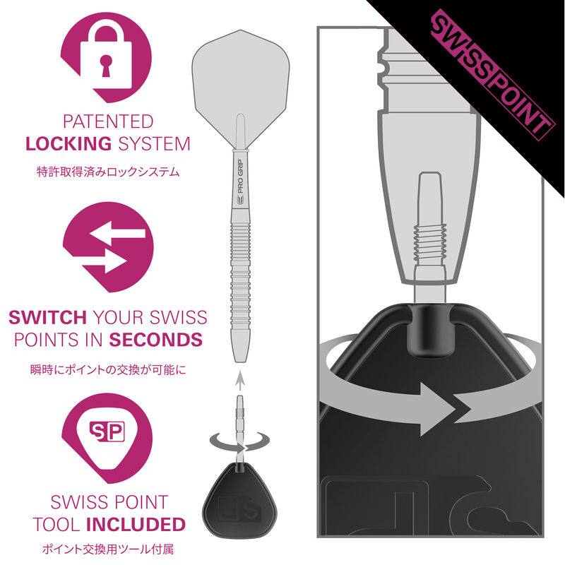 Compatible with the Swiss Point system, this model allows players to change dart points in seconds using the pocket-sized SP tool (sold separately). The system’s innovative tapered thread and custom-engineered groove ensure the point remains firmly locked during play, while enabling quick replacement of broken tips — minimizing downtime and maximizing play continuity.